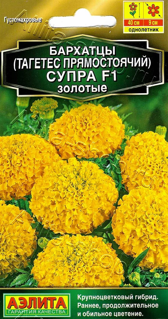 Гибрид бархатцев из серии СУПРА F1 с улучшенными декоративными качествами. Цветение очень раннее и обильное, продолжается с начала лета до первых заморозков. Соцветия густомахровые, крупные (Ø7-9 см), отлично переносят воздействие дождя и ветра сохраняя форму и цвет. Кустики пышные, сильноветвистые, высотой 30-35 см, с большим количеством цветоносов, отличаются выравненностью и компактностью. Растения холодостойкие, неприхотливые к почвам. Великолепно подходят для выращивания в горшках и балконных ящиках, на клумбах, в бордюрах и цветниках.